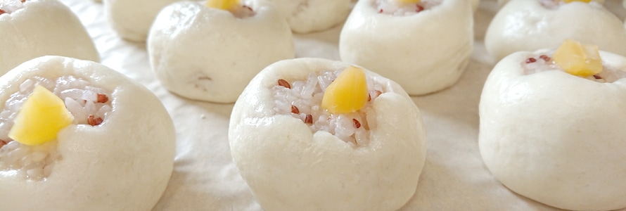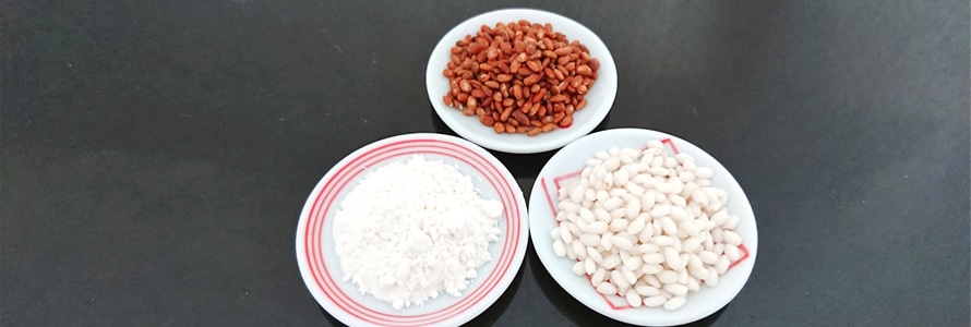 滋賀県産の原料にこだわりたく、赤飯まんじゅうの皮に使用する小麦粉と水も滋賀県産を厳選しました。やわらかな滋賀県産の小麦粉は、滋賀県の天然水を使うことで、ふわふわの生地になります。
