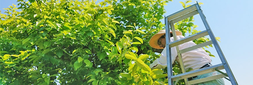 新緑の5月、柿の木からきれいな新芽が出てきます。契約農家から柿の木を提供していただき、本社スタッフみんなで、柿の木の新芽を採りに行きます。大きな木から枝を払い、その枝から葉っぱ一枚一枚を手でもぎとっていきます。
