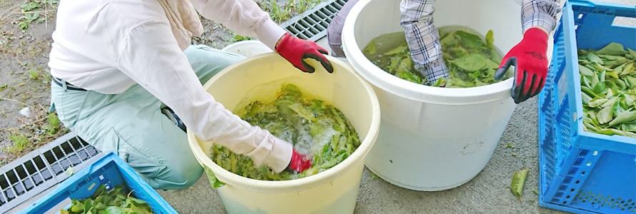 会社に持ち帰った柿の葉を、一枚一枚水洗いをします。水をきった後、蒸し器で柿の葉を蒸しあげ、ネット網に広げて乾燥機にかけます。ここまでの作業を全て手作業で行なっています。