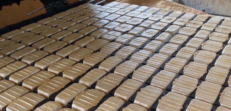 滋賀県近江八幡名物の「丁字麩」は、昔ながらの手焼、原料の配合や生地のこね方、伸ばし方も気候によって微妙に変え、手加減で調整しながら均一の生地をつくっています。